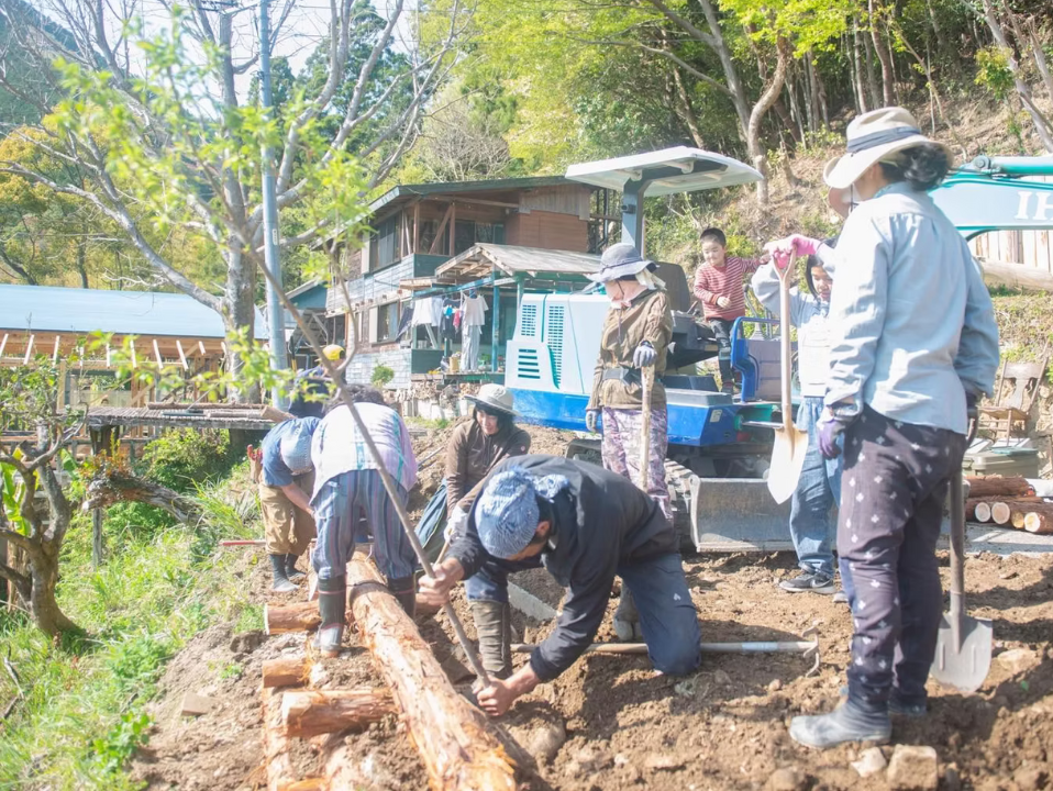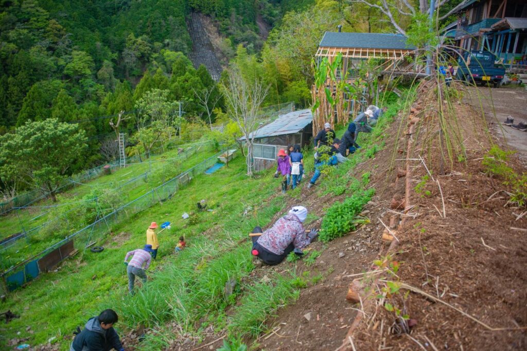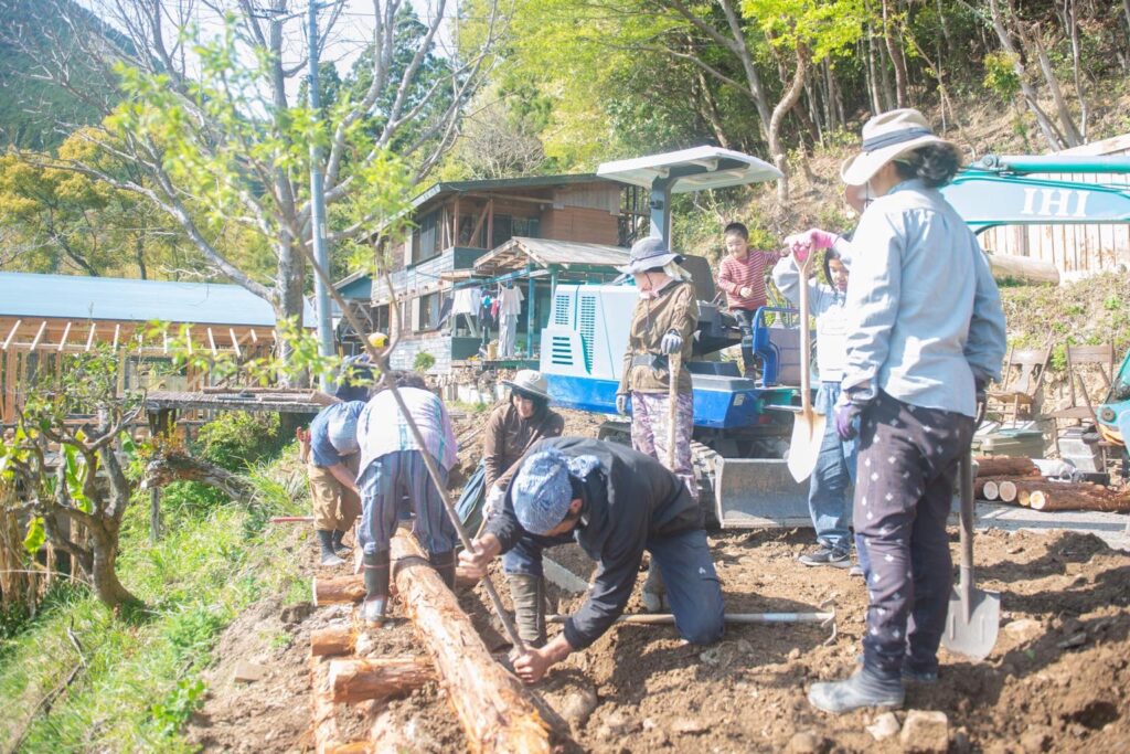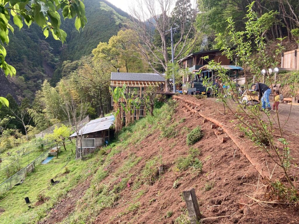 参加者の皆さんは途中からは何も指示せずとも木組みを進めてくれたり、マルチをしてくれたりと作業を進めてくれました。協働作業の醍醐味は、何といっても学びと経験の共有、そして新たな出会いと成長にあると思います。この講座では参加費は頂かず、誰もが無料で参加して頂けます。皆お弁当持参で遠方からお越し下さる方もおり、毎回毎回ありがたい限りです。皆が手弁当で人の土地での作業に参加してくれるということは、実は現代社会では中々経験する機会が少なくなった結(ゆい)の作業の面白さを感じてくれているからではないかと思っています。田んぼや水路、里山などの公益的環境を住民みんなで人手を出し合い作業をして、みんなで維持していく昔ながらの結作業。人間社会では土地の所有制によって個人や法人などが土地を所有して管理することになっていますが、大きな目で見ると自然は全てつながっています。つまり、人の土地だろうが他県での出来事であろうが、全ては我が身に通じるということ。人口減少や核家族化、生活様式の変化などによって今では境界の分からない土地や手入れのされない放棄地がどんどんと増えています。この所有制の仕組みも崩壊寸前だと感じていますが、今はできる人たちが手をつなぎ、一つ一つ目の前のことに丁寧に向き合い、その作業の中から自然の理を学び、成長していくことが大事だと感じています。