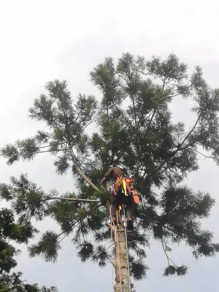 (トップカットと呼ばれる木の頭落としは一番揺れが大きく、緊張の一瞬です。グランドワーカーのロープ操作がものを言う、腕の見せ所です)