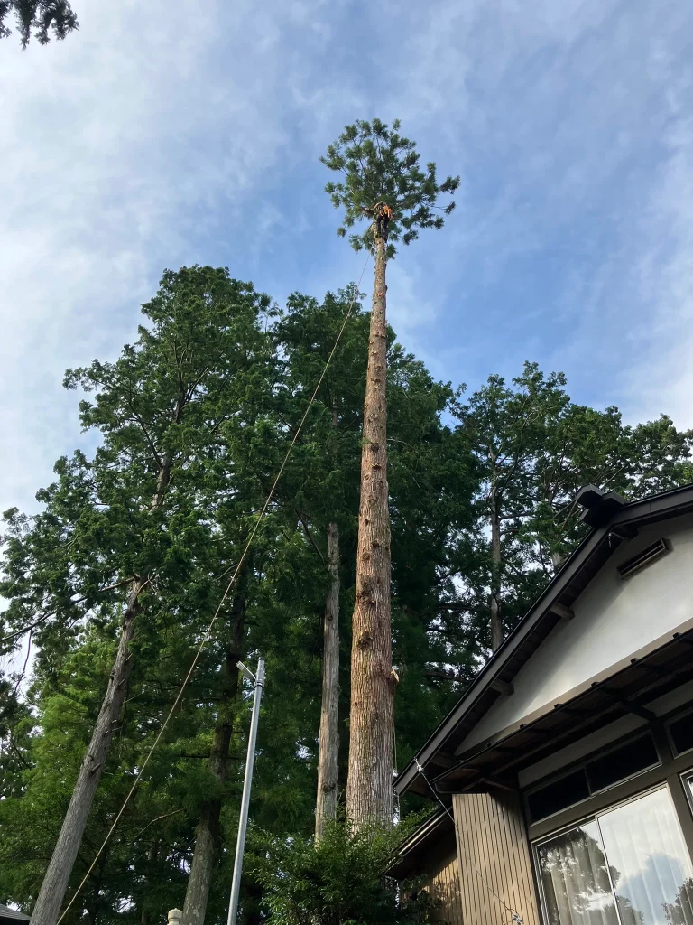先日私の住む町内の神社からご依頼を頂き、境内の杉の特殊伐採をおこないました。社務所のすぐ裏で大きくなってしまった杉を伐採したのですが、実に大きく成長した杉で、胸の高さで幹の直径は約75cm。幹が社務所の軒先に差し掛かってきていた為、伐採作業をおこないました。