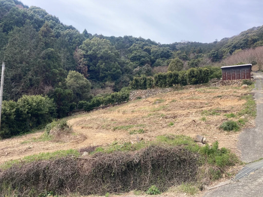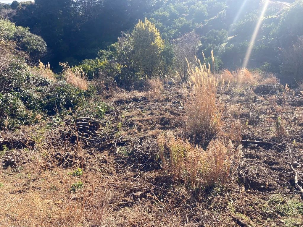 (改植地を遠望する。山腹に位置し、傾斜が若干緩くなった斜面に位置する。場所によっては水がしみ出す部分が散見される尾根の中の微妙な窪み地形。山頂部の広葉樹林と繋がっており、野趣あふれるみかんが育ちそう。日当たり、地質、地形、地力、どれをとっても申し分ない。)