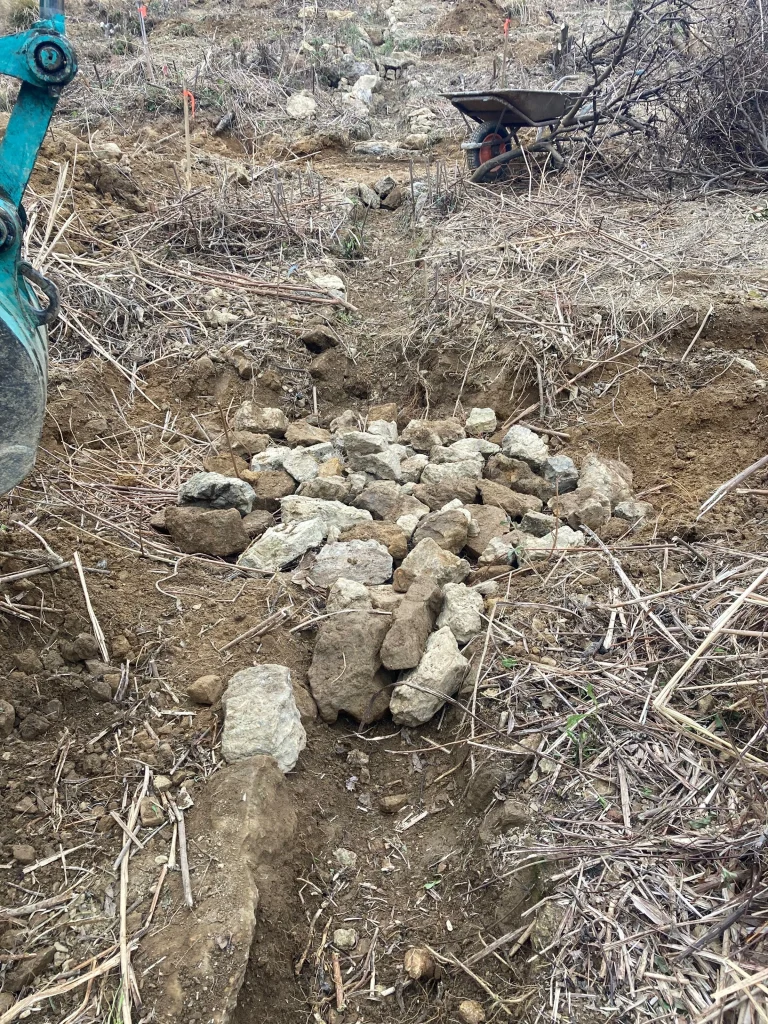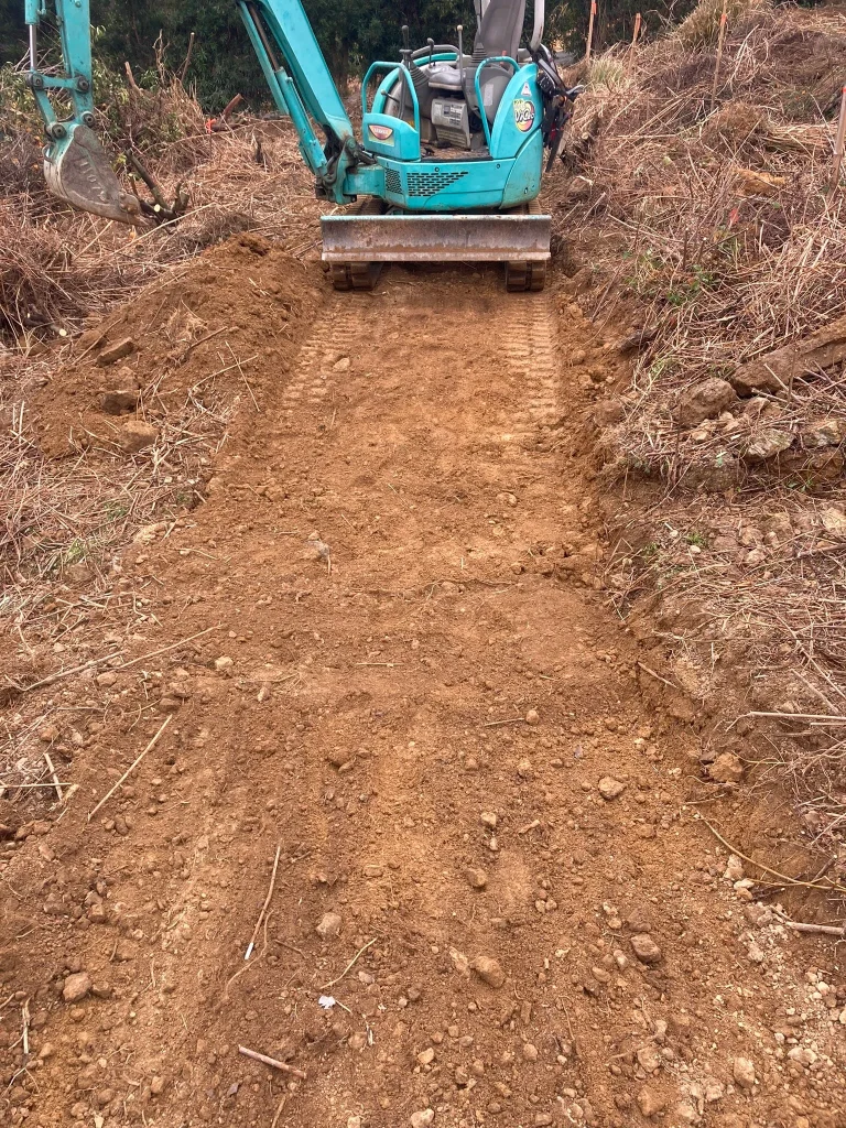 (大園地草刈り後の管理道開設の様子。石が多く、しっかりと固い道が作れる地質だ。表土を丁寧により分け、その場にあった石、草、根などは組み替えていく。)