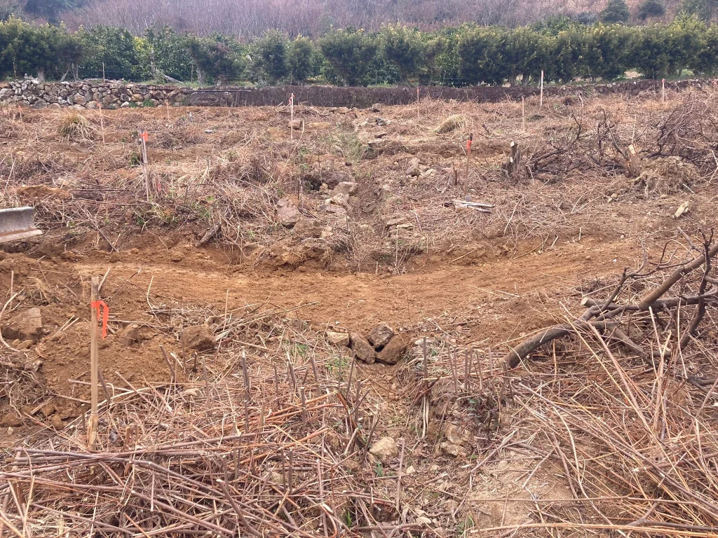 (写真中央の石積みは水路の跡。圃場の様子から見て、恐らく先々代以前に築かれたものではないかと推測。森を開き、石を積み、みかんを育てる。その途方もない労力を垣間見ると、本当に脱帽する思いだ。この水路はしっかりとした観察の上で作られたものであり、道をつけていくと自然と道の勾配がこの水路に向き、ここで排水するのが一番理に叶った形になる。恐らく先代からこの水路の意図を見失い、放置されたんだろう。大切に修復し、再度利用させてもらう。時を超え、会ったこともない人が作ったのものだけど、なんだかこれを作った人とは気が合いそうだ。)