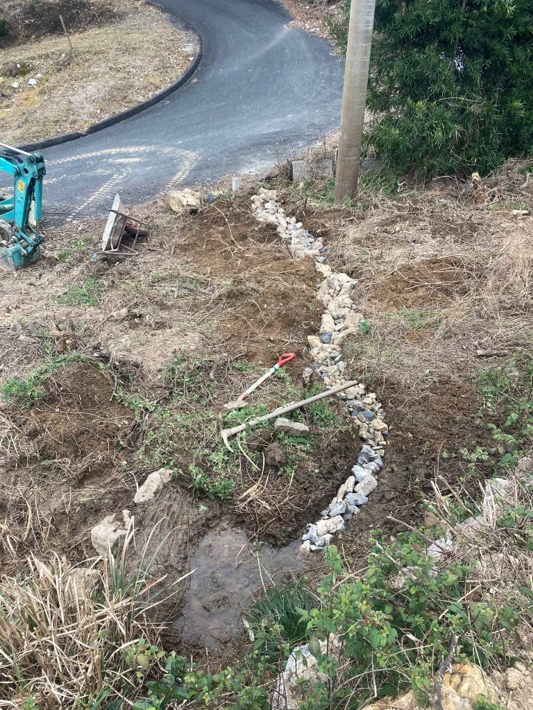 農業を取り囲む環境も年々厳しさを増していく中、私は毎日作物と向き合い、営農している方々を心から尊敬しています。私自身も埼玉県小川町の霜里農場で金子夫妻に弟子入りし、1年間みっちりと修業を積ませて頂き、農業の楽しさ、そして厳しさを体感しました。昨今は物価高や気候変動など、いよいよリスクが増していく環境下で、今後どのような農業の姿を目指していくのか。私は自然の理に叶った方法で農園を管理し、農業者も楽しく生活ができ、収益も上げられ、消費者は農家の生活を支え、そこに住む地域の人々の暮らし、そしてその地域環境に対してもプラスの影響を生む農業の在り方を想っています。それを絵に描いた餅ではなく、実際の現実として起こして見せる為にまず何が必要か?私はそれが農園を管理する為の管理道(作業道)の設計にあると感じ、今回位田さんに水の流れを緩め、雨が大地に浸透していくよう促していくような環境整備を提案しました。その提案が位田さんの描いているビジョンと一致して、実際に作業に入らせて頂くことになりました。