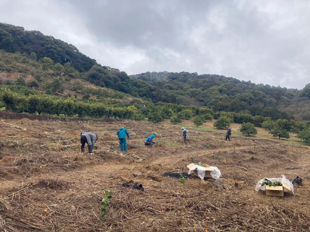 (大園地に位田みかん園のスタッフの皆さんと一緒に苗木を植えていく。根穴を掘り、苗木の根を支え、安定させるように木の枝を根回りに差し込み根を固定する。土を埋め戻したらたくさん水は与えない。大量に水を与える事で根回りの空隙を潰し、根の呼吸不全を招いてしまう。苗木はその場に適応しようと即座に反応し、芽を膨らませたり葉を落とし、秘められていた生命力を解放する。)