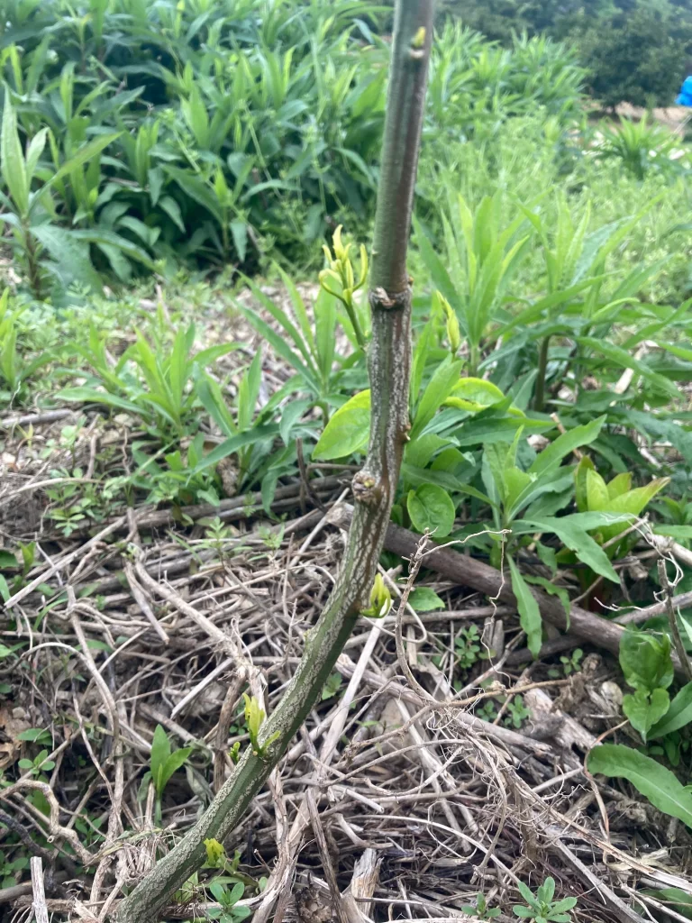 (定植直後に寒さと強風にあい、我慢しながらもしっかりと芽吹いてくれたみかんの苗木)
