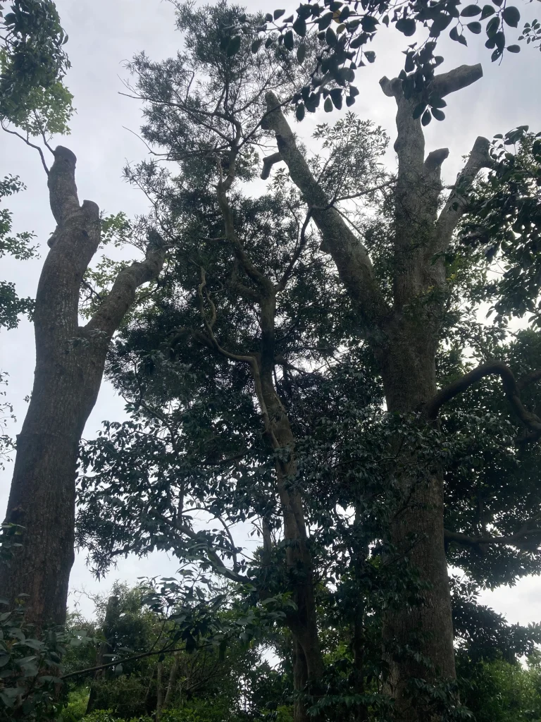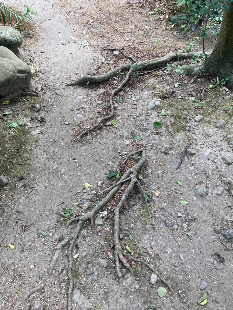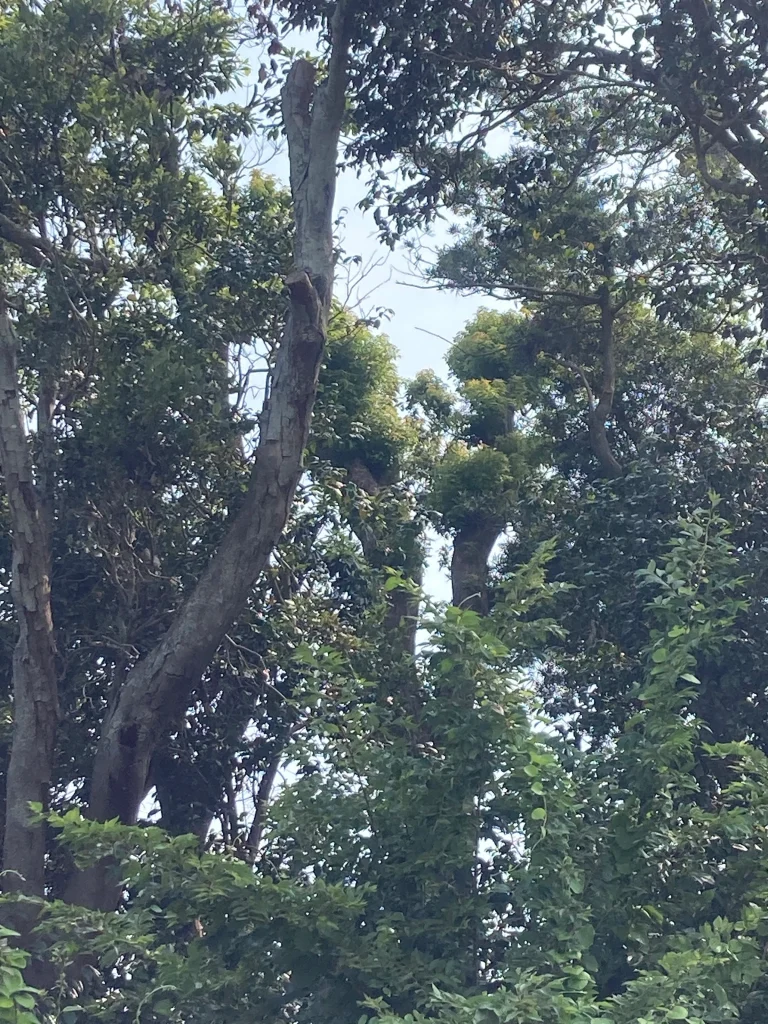 そんな屋敷林も段々と背丈が高くなり、周辺住民からの不安も増してきているということで、全体的に背丈を1/3ほど低くし、杜に差し込む光を調整することで大木の幹の下の方から生えてくる萌芽を促し、杜全体の重心が低くなるように仕立てることに。それによって強風によるあおりに強く、どっしりとした杜の姿に整えて、周辺住民の不安も解消していけるよう取り組ませて頂きました。下見をした当日はかなりの強風で、この杜がどのように風を受けるのか観察するには絶好の天気でした。風に吹かれている間、杜の木々は見事に一体となって大風をちらし、林内を洗い流すかのような適度な風を通し、大風の力を味方につけて林内を活性化していました。根が揺らぐ様な風の受け方はしておらず、大地にがっしりと一丸となって根を張っています。ただ、林内はだいぶ蚊が多くなってきており、もう少し光と風を通してあげたいという状況になってきておりました。