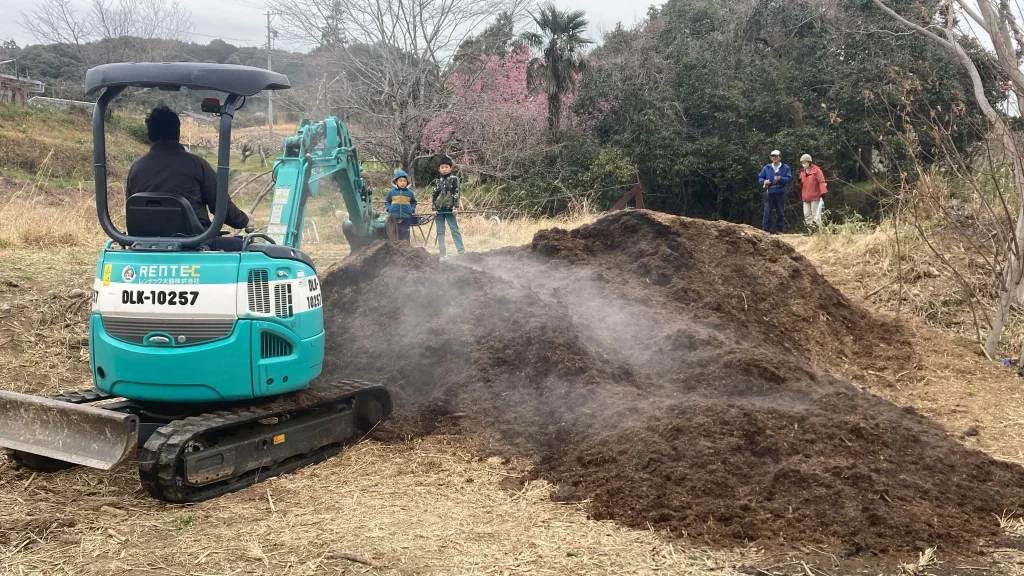 田んぼ全体にこの氣水脈を掘って繋げたら、これまた酵素水をかけて発酵させた腐葉土を動線上に施します。これは地表面を保護して木々の表層根を育むことと、敷地に土着する微生物さん達を活性化し、地表部での好氣性発酵を活発にすることを意図しています。それによって好氣性発酵(地表)から嫌氣性発酵合成(地下)への菌さん達の『菌脈』がつながり、共存共栄の情報がより色濃くインプットされることになります。菌さん達は宇宙のエネルギーに敏感に反応しており、そのエネルギーを直接代謝に変える力を持っている為、目には見えずとも木々の枝葉や根のようなエネルギーキャッチ網を張り巡らせてくれます。また、堆肥は子ども達が裸足で走り回れるように足を守ってくれます☆