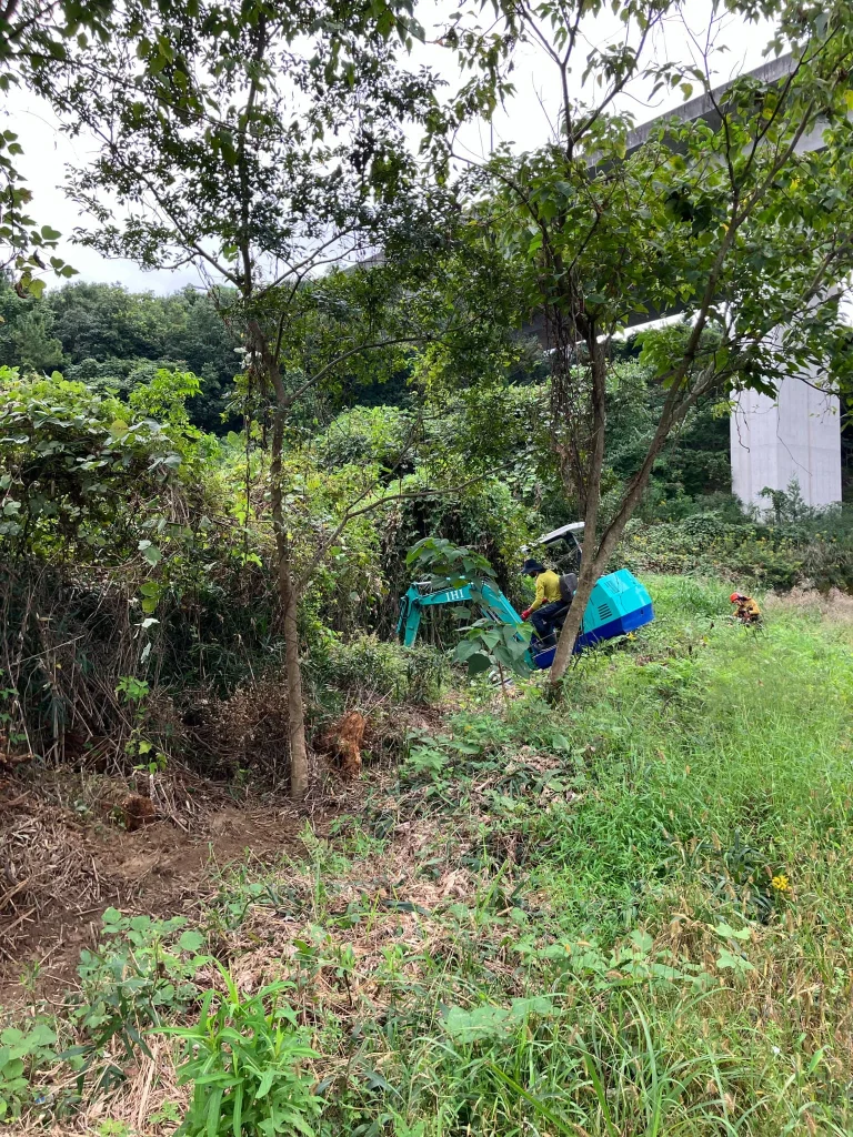 この氣脈はそのまま人の動線となり、みんなが心地よく動きやすいアウトラインを作っていきます。動線上に飛び出した笹竹を根気よく草刈り機で切り、竹の根は重機ではがしとっていきます。