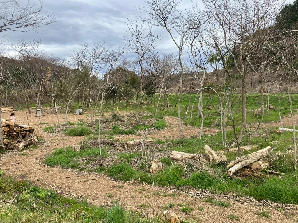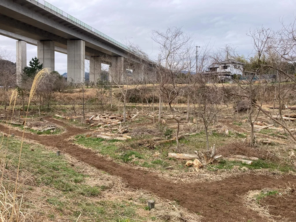 プレイパークとして整備する場所は耕作放棄された元田んぼで、お米作りを止めた後は杉の木が植えられました。その後周囲の人たちから花粉が飛散すると苦情が入り、杉の木が伐採されて幹が多数横たわっています。その後は手入れされることなく笹薮となり、誰も侵入できないほどに植物が生い茂っていました。