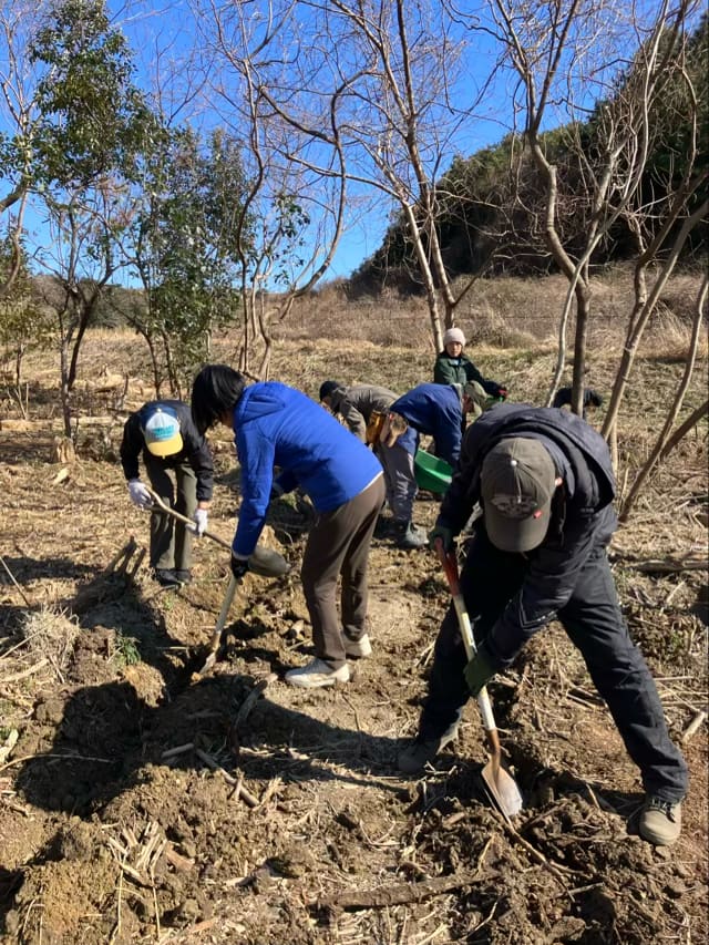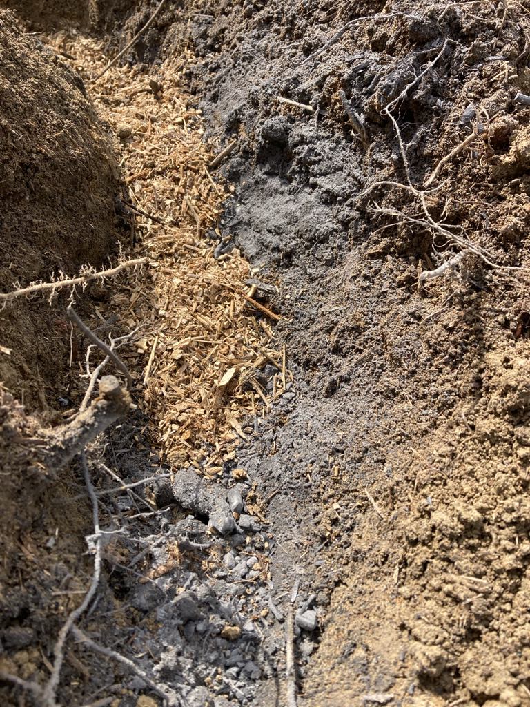 ここからがWSでおこなった作業ですが、動線となる歩き道の両側に重機で溝を切り、軽くスコップで掘り上げていきます。こうすることで地表面に高低差が生じ、溝部分で地下へ吸い込まれる空氣の圧力が高まります。さらに硬くなった地表面をほぐすことでより地下に空氣と水が浸透しやすい地形をつくり、地上と地下を繋ぐ円滑な脈環境を育てます。