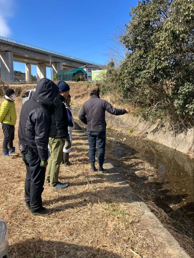 (作業前に敷地全体を歩いて周囲を観察。何故植物が暴れているのか、川に土砂が溜まってしまうのかなどを観察・説明)