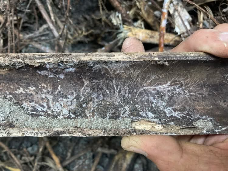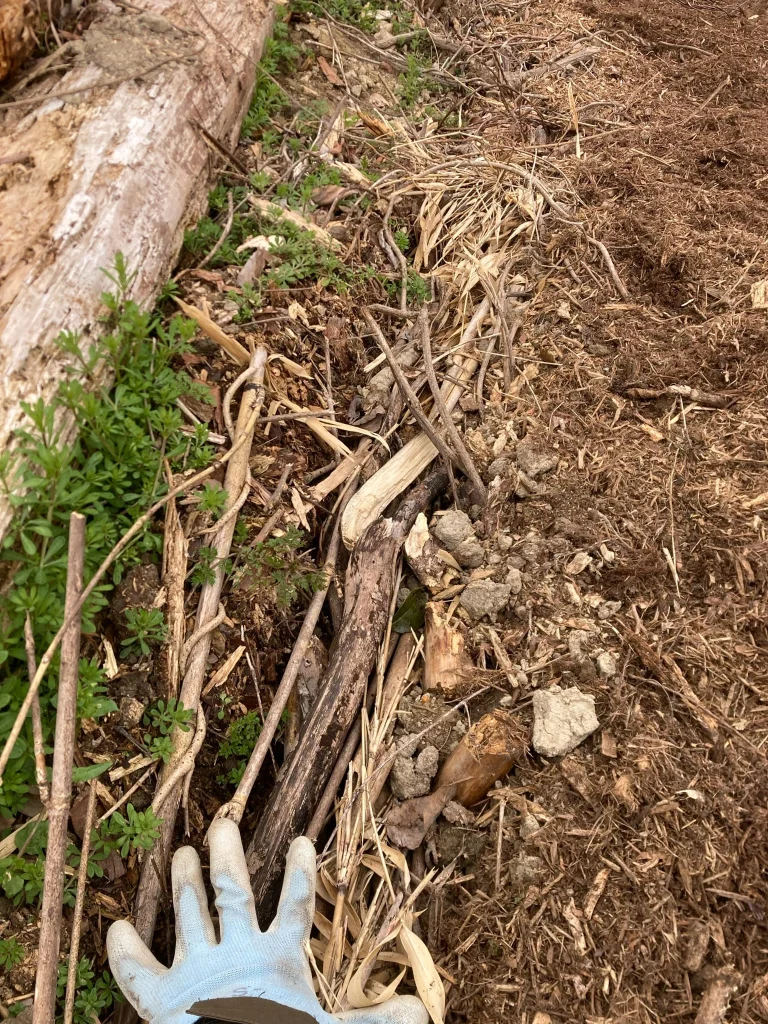 溝底部分にはエネルギーを宿しやすくするよう炭を少々入れ、我が家で使っているバイオトイレから生まれる酵素水を噴霧して発酵させた竹チップを施します。乳酸菌主体に発酵したチップには白い菌糸が繁殖しており、地上と地下を繋ぐ大切な役目を担ってくれている木々の根張りを助けます。溝はそのままだと雨風にさらされて元の地形に戻ったり泥詰まりしてくるので、周囲の竹や木枝をさらっと詰め、脈地形を保持します。その後は軽く土をかけて湿氣を宿し、周囲を均します。